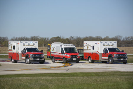 Three of the Fort Dodge Fire Department’s ambulances line up awaiting “victims” during the full-scale disaster exercise at the Fort Dodge Regional Airport on Tuesday morning.