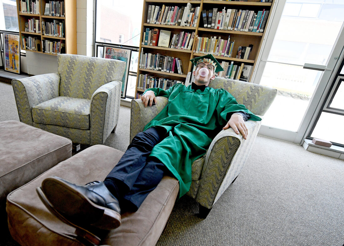 Soon-to-be graduate Johnny Dickerson blows a bubble while waiting in the library before St. Edmond commencement ceremonies on Sunday.