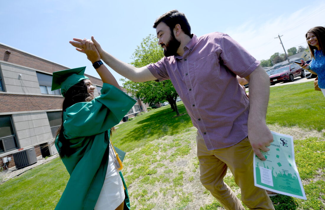 Sean Flaherty, of Fort Dodge, gives his sister, St. Edmond graduate Katie Flaherty, a high five after she receives her diploma on Saturday at St. Edmond High School