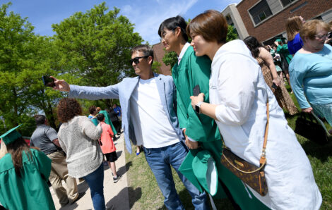 Graduate Yoon-Sang Kim takes a selfie with his parents Jeyoung Kim, left, and Myungjin Jang after the St. Edmond commencement ceremony on Sunday.