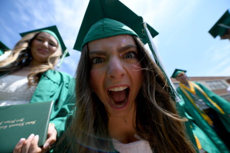 Graduate Sylvia Hess screams for joy after the St. Edmond commencement ceremony on Sunday afternoon.