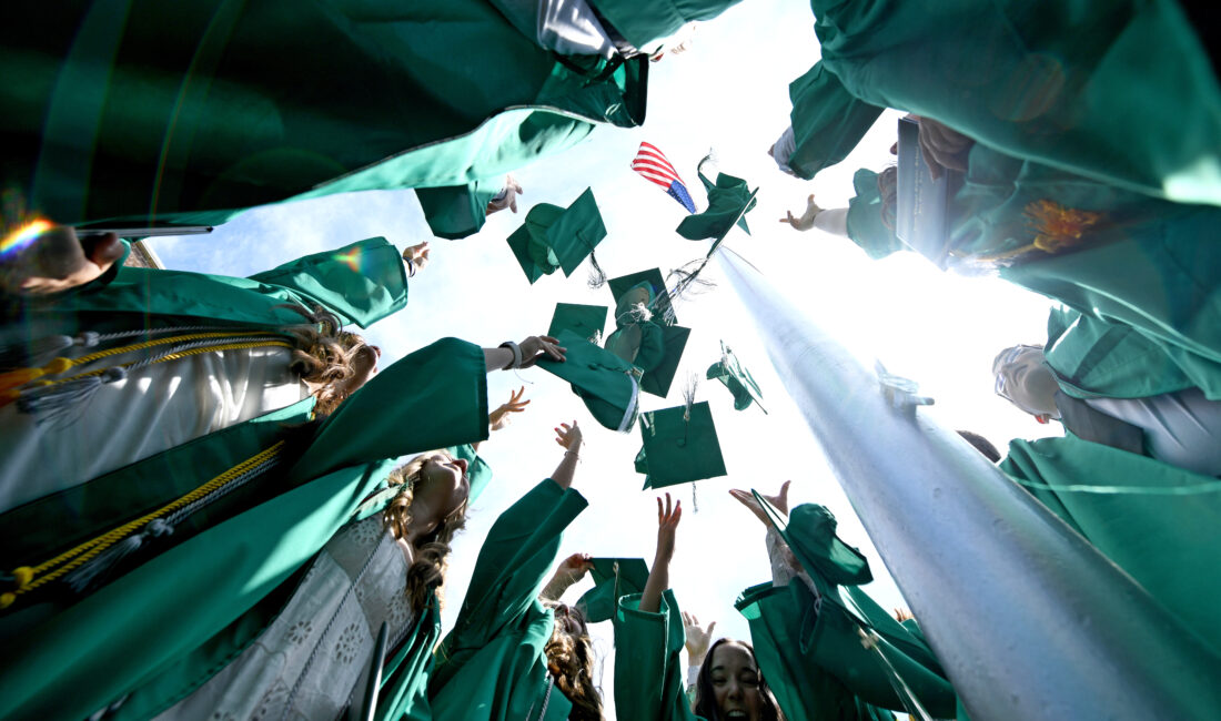The St. Edmond Class of 2023 tosses their caps in the air after singing the St. Edmond school song on Sunday.