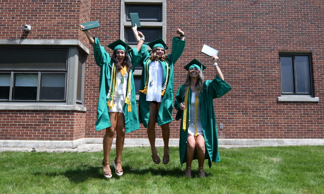 St. Edmond graduates, left to right, Addison Schulte, Sylvia Hess and Madysen Halverson jump for joy after graduating from St. Edmond on Sunday.