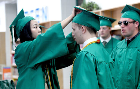 Lilian Shin helps fellow graduate Kevin O’Connor with his cap before the St. Edmond commencement ceremony on Sunday afternoon.