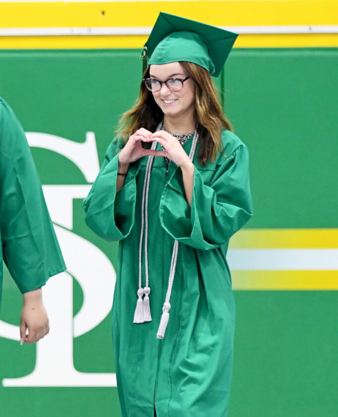 Alivia Torkelson gives a heart symbol to her family as she walks down the aisle during St. Edmond commencement ceremony on Saturday