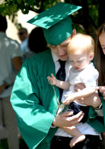 Graduate Braydon Smith lets his younger brother Deacon Smith, 11 months, play with his tassel after St. Edmond commencement on Sunday.
