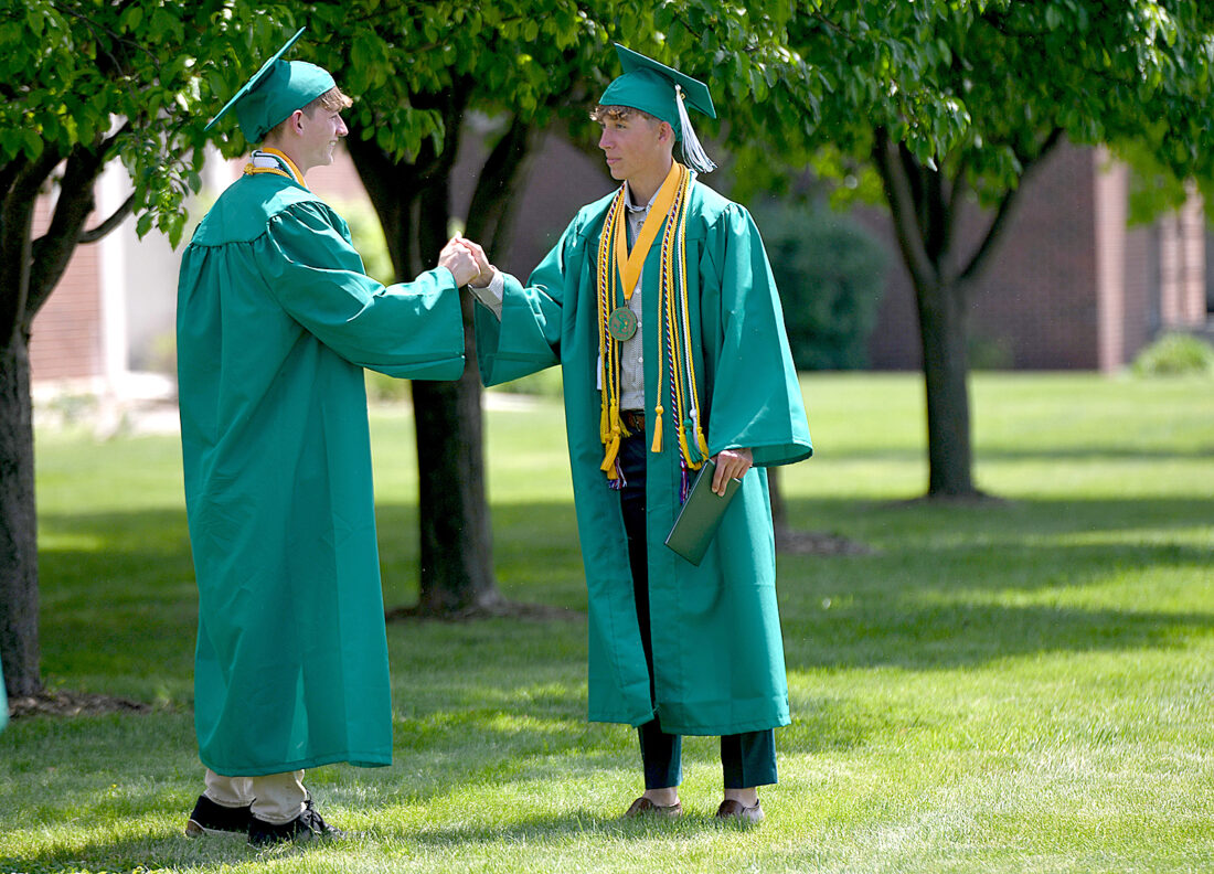 St. Edmond graduates, from left, Aaron Lursen and Carter Rial practice their unique handshake after St. Edmond commencement ceremonies on Sunday.