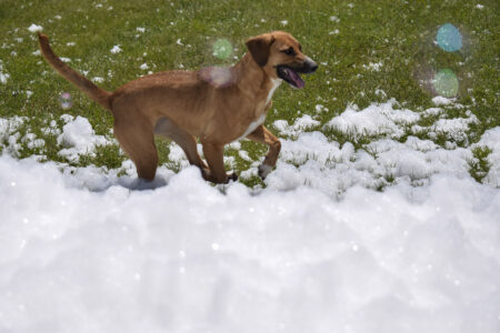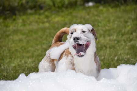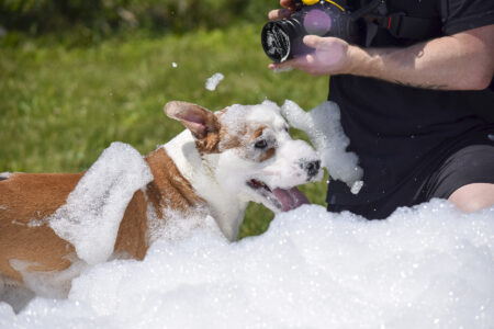 No, he didn’t escape bath time — he was jumping through a cloud of foam during a foam party for the shelter dogs.