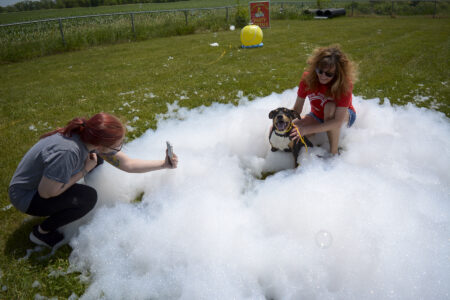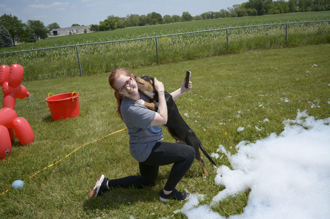 Almost Home staff member Allix Black snaps a photo of Wiley, a hound mix available for adoption, and Almost Home board member Tammy Grove during a foam party for the shelter dogs on Tuesday afternoon. On June 24, the animal shelter, in partnership with Duck King Fun Party Rentals, will host a foam party for dogs in the community as a fundraiser for the shelter.