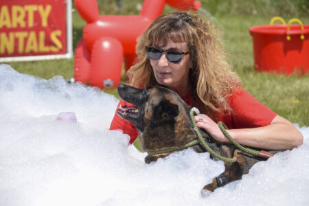 Tammy Grove, a member of Almost Home’s board of directors, cools off with her dog, Shep, in the foam pit during a foam party for the dogs at the shelter on Tuesday afternoon.
