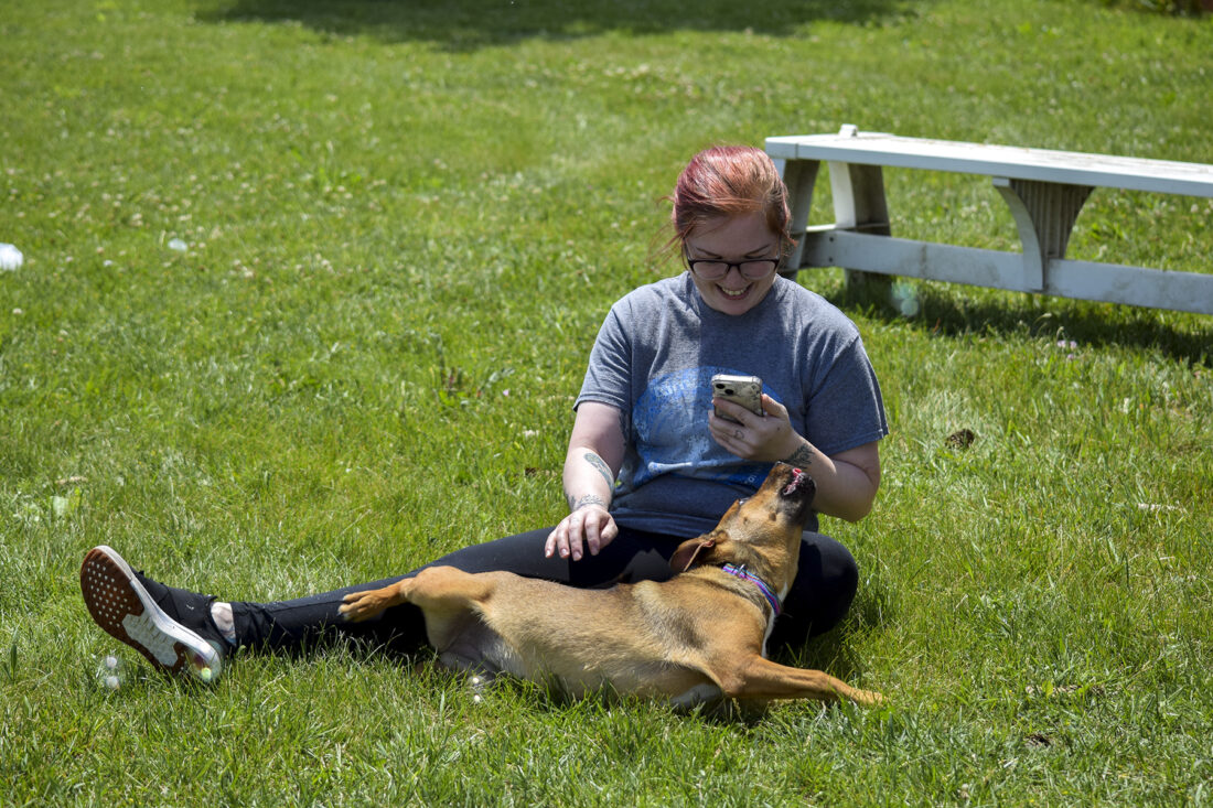 Millie, an Austrialian cattle dog available for adoption, takes a break in the grass with Almost Home staff member Allix Black on Tuesday afternoon.