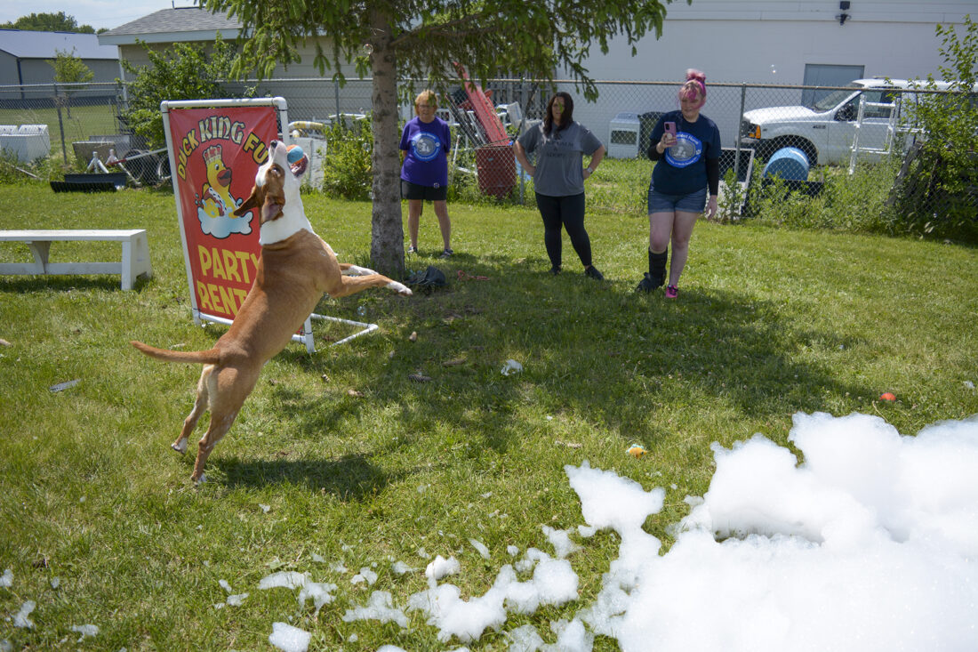 Donovan, an American pit bull terrier available for adoption, enjoys his time frolicking in the foam during a small foam party for the dogs at the Almost Home Humane Society of North Central Iowa on Tuesday afternoon. Tuesday’s foam party was a test-run for a fundraiser the animal shelter plans to host on June 24.