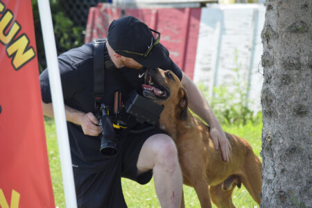 Donovan, an American pit bull terrier available for adoption, makes sure to get some suds on videographer Brock Adams’ camera lens during Tuesday’s foam party at Almost Home.