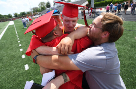 Fort Dodge 2023 graduates Levi Evans (center) and Michael Miller, along with Aiden Heistand and Carson Kahler gather for a group hug following the Fort Dodge Senior High commencement ceremony on Sunday inside Dodger Stadium.