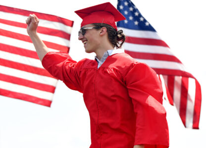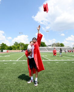 Javion Jondle, of Fort Dodge, tosses his cap into the air, while his son Legend Lowrey-Jondle (10 month) watches after Fort Dodge Senior High’s graduation Ceremony on Sunday inside Dodger Stadium