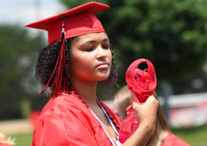 Gabby Schumacher, of Fort Dodge, uses a fan to cool off before the Fort Dodge Senior High commencement ceremony on Sunday inside Dodger Stadium.