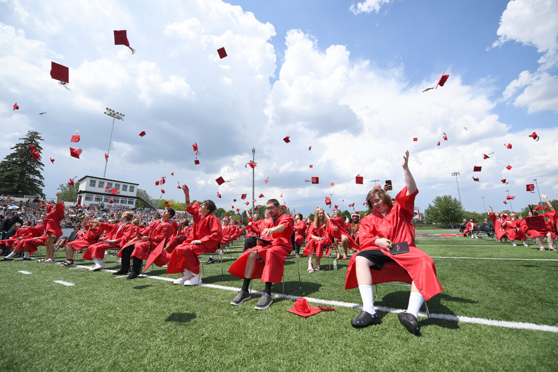 The Fort Dodge Senior High Class of 2023 tosses their mortar boards into the air following Sunday’s commencement ceremonies inside Dodger Stadium.