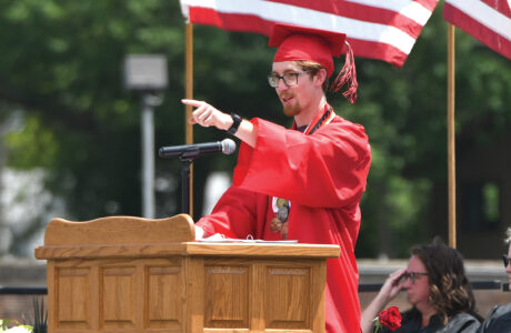 Ryan Madden, of Fort Dodge, speaks to the Class of 2023 during Fort Dodge Senior High’s commencement ceremony on Sunday afternoon at Dodger Stadium.