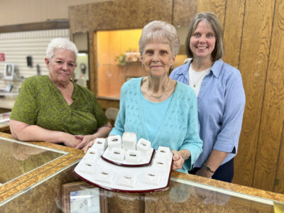 Wicker Jewelry co-owner Marilyn Simonson, center, holds up a display of diamond rings. Next to her are employee Marti Pickett, left, and Simonson’s daughter, Lynn Zeka.