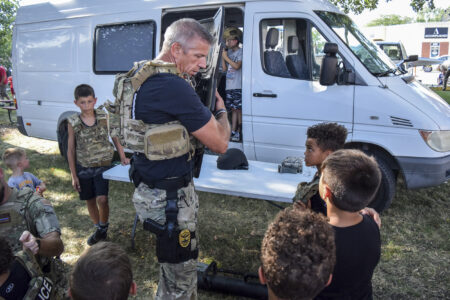 Fort Dodge Police Department Chief Dennis Quinn, then a captain, shows a group of kids some of the equipment used by the Fort Dodge/Webster County Special Emergency Response Team during National Night Out in August 2022.
