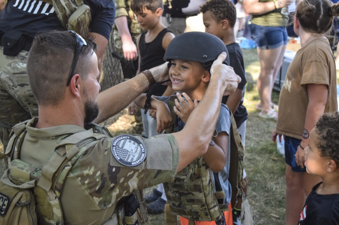 Fort Dodge Police Department Lt. Zach Stanley places a helmet on Teyden Junkman, then 5, of Fort Dodge, while showing the kids the equipment the Fort Dodge/Webster County Special Emergency Response Team uses at National Night Out at City Park Square in August 2022.