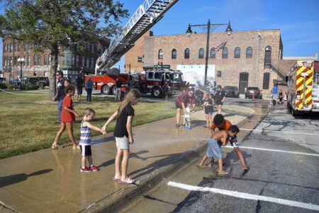 Several kids play in a water sprinkler coming from a Fort Dodge Fire Department ladder truck at National Night Out in August 2022.