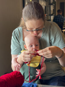 The group’s youngest member is three-month-old Miles McIntosh, son of Chelsea Esterline, of Fort Dodge. He sits on his mother’s lap while she knits a sleeve that will eventually be added to a sweater for him to wear next winter. Every so often one of his dozen or so surrogate grandmothers will come by their side of the table to try to elicit some smiles and laughs from Miles.