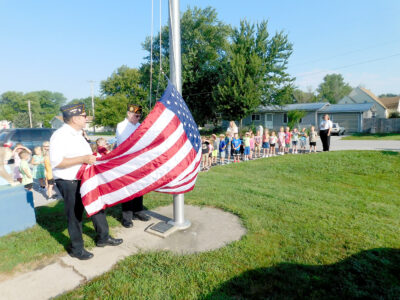 Verlyn Kirchoff, commander, at left, and Randy Stein, from American Legion Post 204, prepare to raise the flag on the first day of school Wednesday morning at Manson Northwest Webster Elementary in Barnum, as a class of kindergarten students looks on.