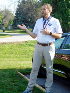 Manson Northwest Webster Elementary Principal Bret Larson addresses the preschool through sixth-grade students and staff gathered in front of the school for the flag-raising ceremony Wednesday.