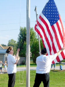 Randy Stein, left, and Verlyn Kirchoff, commander of American Legion Post 204, raise the flag on the first day of school Wednesday at Manson Northwest Webster Elementary in Barnum.