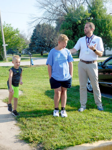 Manson Northwest Webster Elementary Principal Bret Larson demonstrates how quickly the years pass from kindergarten to sixth grade, as kindergartner Cade Cabrera, left, and sixth-grader Sebastian Geerdes, center, help illustrate his point. His advice to all elementary students on the first day of school was simple: “Make the most of your days, work hard and be nice to each other.”