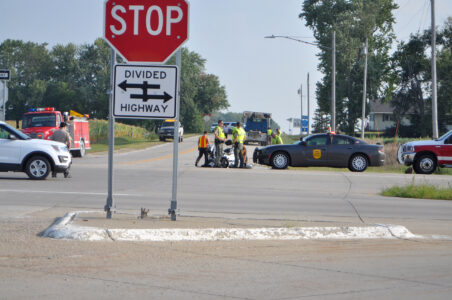 Webster County sheriff’s deputies and other emergency responders work at the scene of a fatal crash involving a motorcycle at the intersection of U.S. Highway 20 and Johnson Avenue late Tuesday afternoon. Iowa State Patrol Sgt. Neil Morenz said the driver of the motorcycle, Daniel Brown, of Webster City, died at the scene. The crash was reported at 4:37 p.m. Morenz said Daniel Lundberg, of Lehigh, was driving a 2010 International truck south on Johnson Avenue. He said Lundberg crossed the westbound lanes of the highway, but failed to yield in the median to eastbound traffic. Brown was heading east on a 2018 Indian Chieftain Elite motorcycle, which struck the side of the truck. Lundberg was uninjured. Moorland firefighters and an ambulance from the Fort Dodge Fire Department also responded.