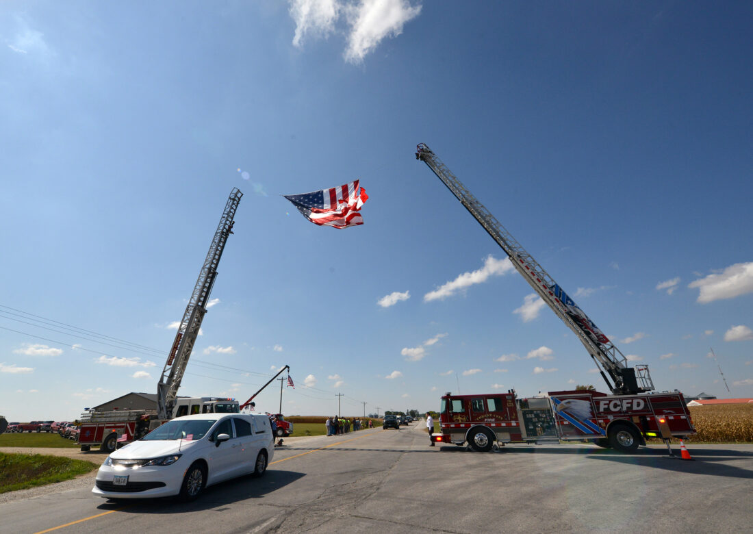 The funeral coach carrying slain Algona Police Officer Kevin Cram moves east along 210th Street Wednesday afternoon under a giant flag suspended from a Clear Lake, at left, and Forest City fire trucks.