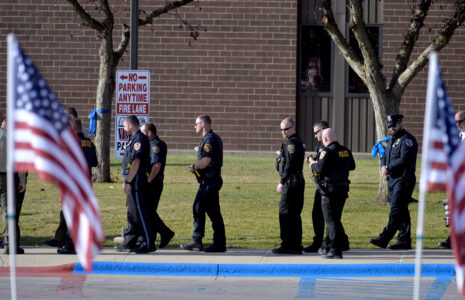 Some of the hundreds of police officers from throughout Iowa enter the Algona High School Wednesday morning for the funeral service for slain Algona Police Officer Kevin Cram.