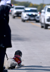 Rosy, a First Responder Service Dog that works with the Clear Lake Fire Department, watches the funeral procession for slain Algona Police Officer Kevin Cram travel east along 210th Street as her firefighter humans salute