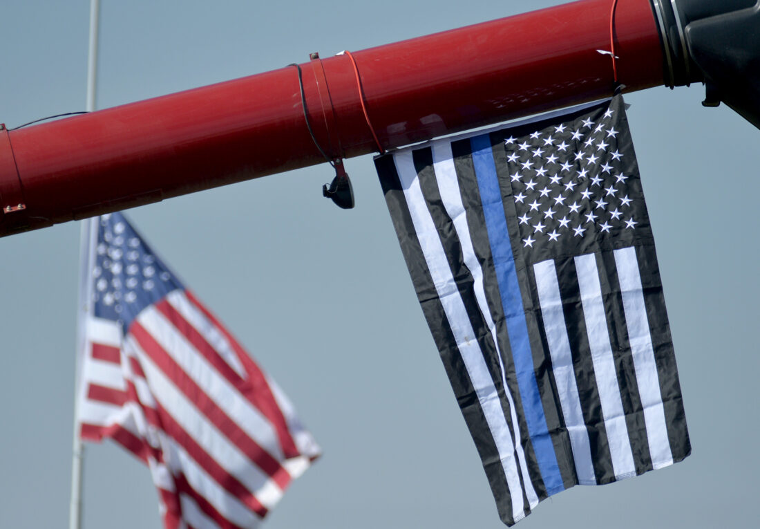 A Blue Line flag hangs from a combine spout as the U.S. Flag flies at half staff just east of Algona Wednesday afternoon.