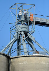 A group of elevator workers found a high vantage point to watch the funeral procession for slain Algona Police Officer Kevin Cram leave the Algona High School Wednesday.