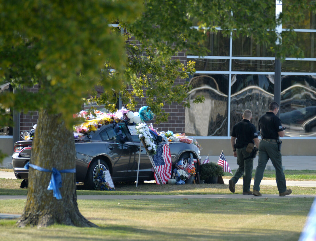 A pair of police officers walk past a squad car decorated with flowers and other memorial before the start of services for slain Algona Police Officer Kevin Cram Wednesday at the Algona High School.