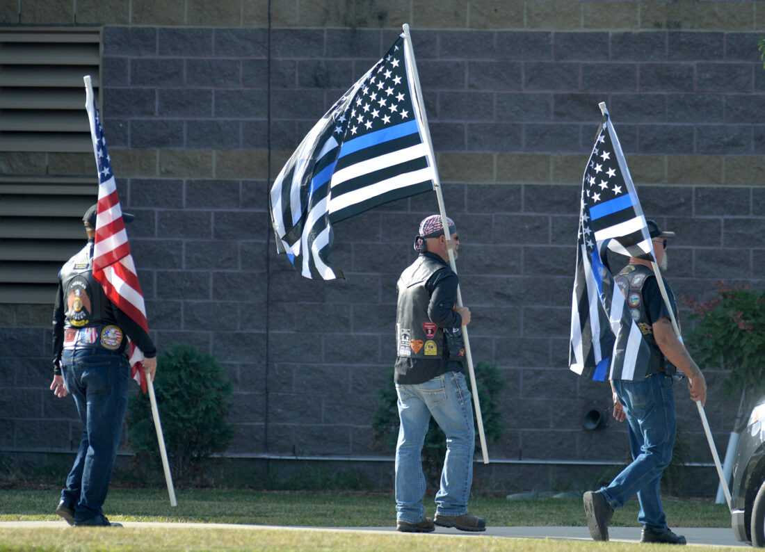 Members of the Patriot Guard Riders make their way towards the door of the Algona High School Wednesday morning for the funeral of slain Algona Police Officer Kevin Cram.