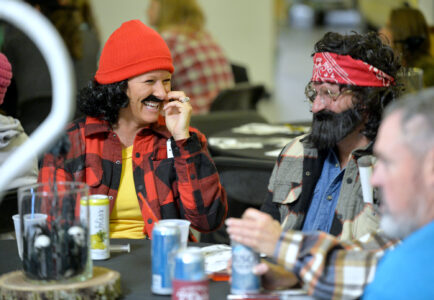 Jenny “Cheech” Roe, of Fort Dodge, at left, had a little trouble with her mustache as Jake “Chong” Nelson, of Fort Dodge, looks on. The pair were attending the Community Health Center’s annual fundraiser, “Costumes and Comedy,” at Shimkat Motor Company Saturday evening. Staying in character, the pair made it known that “Dave’s not here.”