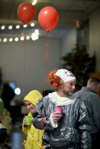 Mike “Pennywise” Chase, at right, along with his wife, Lisa “Georgia” Chase, enjoy themselves Saturday evening during the Community Health Center’s annual fundraiser, “Costumes and Comedy,” at Shimkat Motor Company.