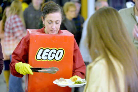 Mary Kay Daniel, of Fort Dodge, found out that going through the food line in a LEGO costume might not be the easiest thing to do Saturday evening during the Community Health Center’s annual fundraiser, “Costumes and Comedy,” at Shimkat Motor Company.