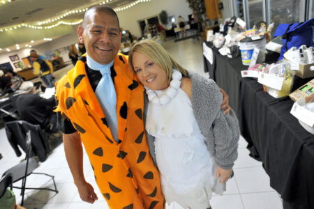 Joe “Fred” Seca, of Fort Dodge, along with Toni “Wilma” Schroier, also of Fort Dodge, show off their cave dwelling outfits Saturday evening during the Community Health Center’s annual fundraiser, “Costumes and Comedy,” at Shimkat Motor Company.