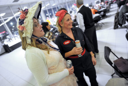 There’s no pulling the wool over the eyes of Anne “Bo Peep” Feser, of Fort Dodge, as she enjoys her evening with Annie “Rosie Riveter” Wolfe, also of Fort Dodge, during the Community Health Center’s annual fundraiser, “Costumes and Comedy,” at Shimkat Motor Company Saturday evening.