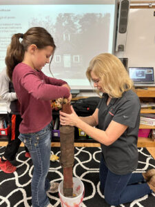 An antique, hand-held corn planter also offered a unique, hands-on learning experience for the students. The kids quickly learned how to open and close the wooden handle so the seeds would fall accurately from the planter box to a bucket, which was used in place of soil in this classroom lesson.