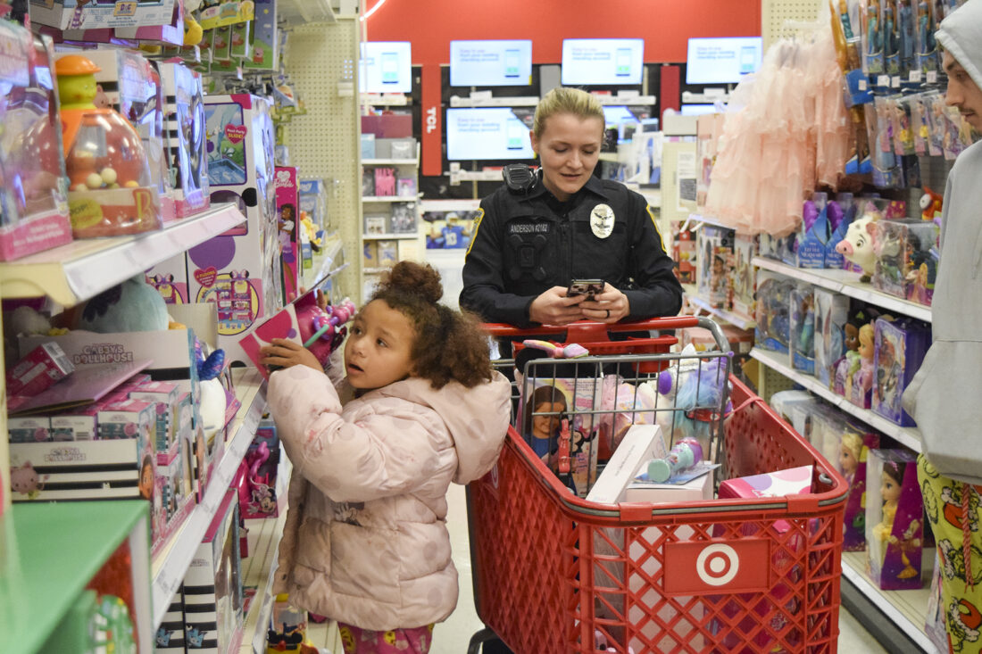 Lilyana Johnson, 5, picks a toy off the shelf while Fort Dodge Police Officer Madison Anderson calculates how much they have left in their budget for their Santa Cops shopping spree at Target on Wednesday evening.