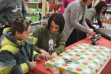 After shopping, the children could stop by a gift-wrapping table staffed by Legacy Realty staff to wrap their purchases.
