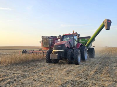 The Hartwig family harvests a soybean field northeast of Lake City in early October this past fall. Ross Hartwig, of Rockwell City, is driving the combine, and his daughter-in-law, Shelly Hartwig, is running the tractor and catch wagon. Ross is 94 years old and has farmed in Calhoun County his whole life.