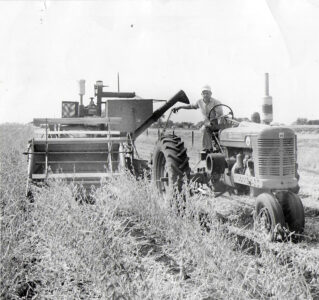 Ross Hartwig, of Rockwell City, harvests soybeans with a pull-behind combine in this photo, circa 1955, provided by the Hartwig family.