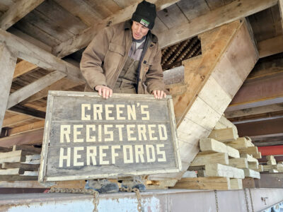 An old wooden sign in the haymow with the words “Green’s Registered Herefords” hints at one way the barn was used decades ago. The barn was part of a farmstead that included a two-story farmhouse, corn crib, grove and small outbuildings.